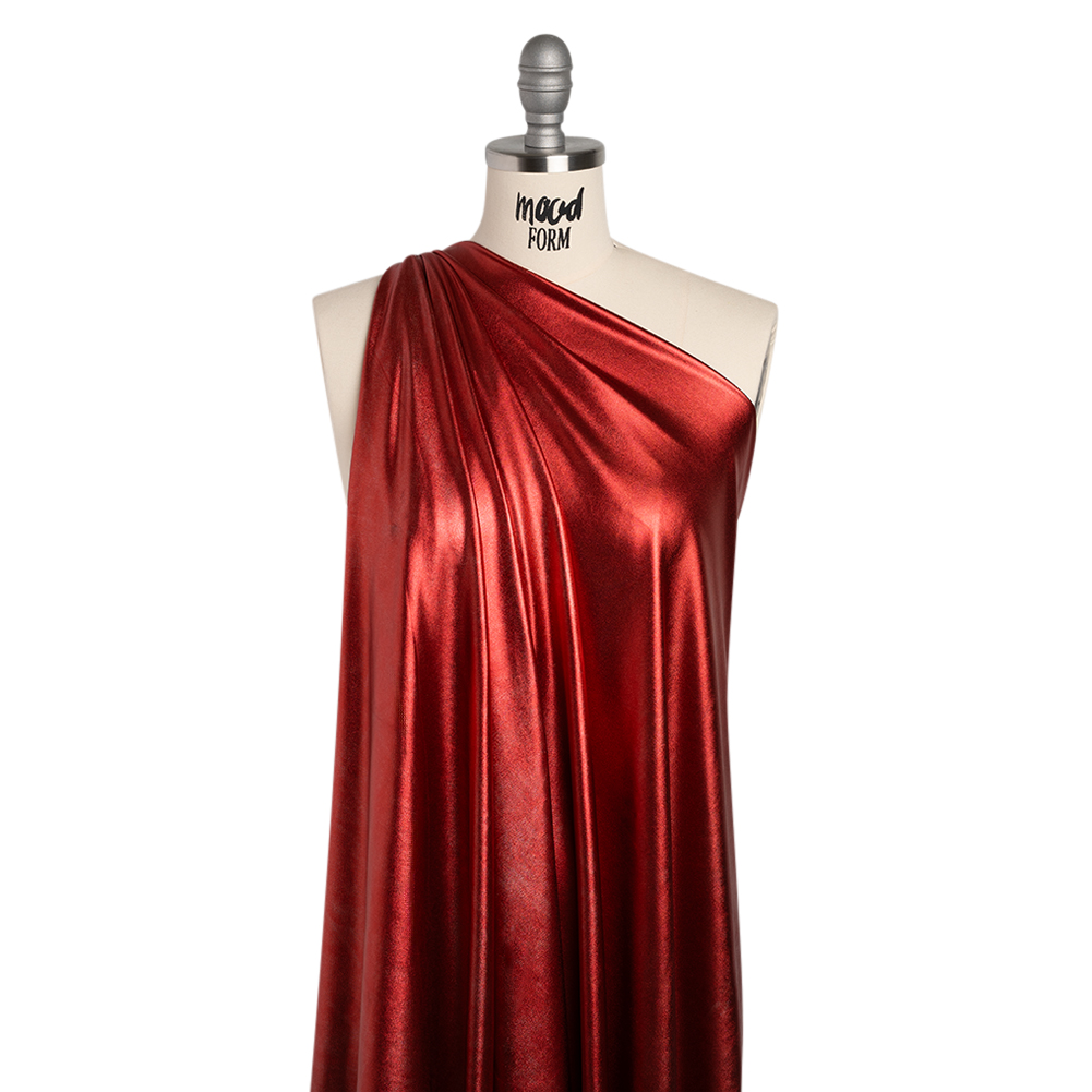 You’ll be photo red-y in this Red Metallic Foiled Stretch Polyester Jersey by Yaya Han—featuring a sleek hand and flexible drape.Suggested Projects: Skirts, Pants, Jackets, CostumesContent: 94% Polyester, 6% SpandexStretch: 25% Weftwise, 15% WarpwiseOpacity: OpaqueStep into worlds beyond imagination with this metallic red jersey. Designed with cosplayers in mind, it features a dazzling foiled finish and a slight all-way stretch—perfect for bringing to life characters from superheroes to anime legends and sci-fi icons. Its sleek hand and flexible drape make it ideal for crafting skirts, pants, jackets, and bold costumes. The all-way stretch molds effortlessly to your form, making bodycon fits a breeze. Opaque, a lining can be added for extra structure and support. Whether you're on the convention floor or center stage, this fabric is ready to shine!
