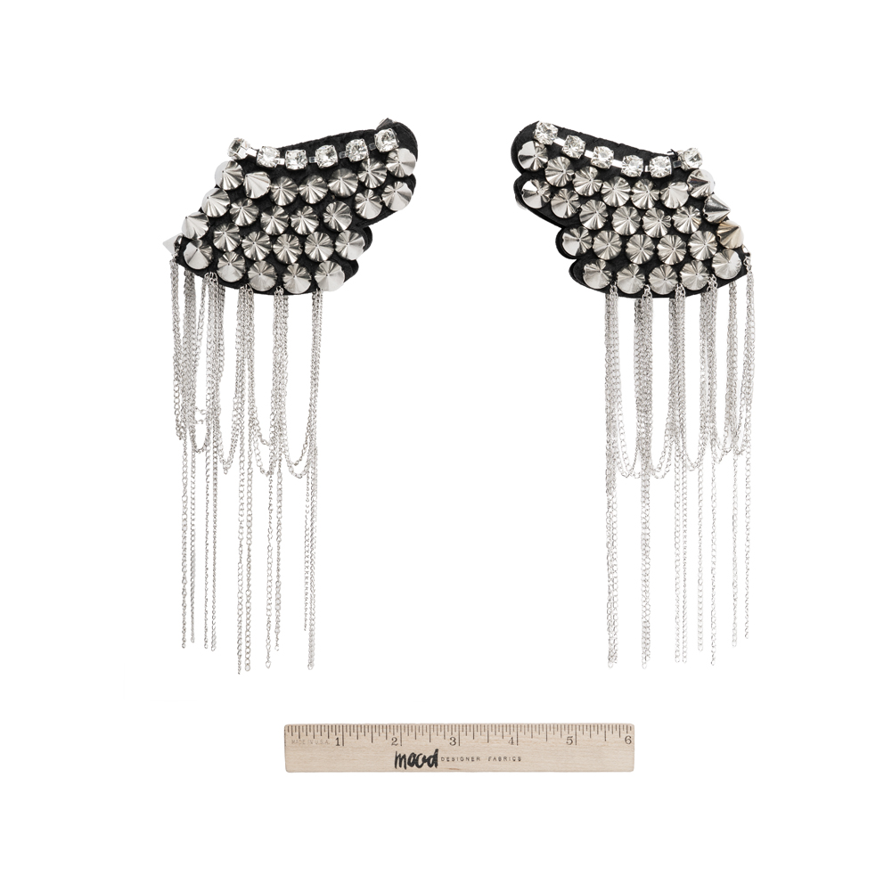 Step into your stage person with these London Punk Silver and Black Rhinestones and Spikes Shoulder Epaulettes with Metal Chain Fringe—featuring a super tactile hand and edgy look.
