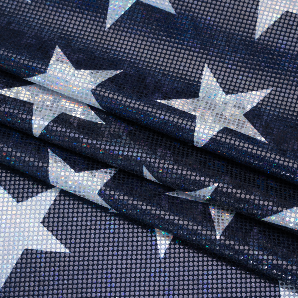 Your favorite superheroes await you in this Navy and Silver Stars Stretch Polyester Jersey Print with Holographic Foiling by Yaya Han—featuring a sleek hand and flexible drape.Suggested Projects: Skirts, Pants, Jackets, CostumesContent: 95% Polyester, 5% SpandexStretch: 50% Weftwise, 25% WarpwiseOpacity: TranslucentSilver stars march across a deep navy backdrop, their brilliance amplified by a holographic foil overlay—ready to accompany you on your night serving vigilante justice. Designed with cosplayers in mind, it features a dazzling holographic foiled finish and a moderate all-way stretch—perfect for bringing to life characters from superheroes to anime legends and sci-fi icons. Its sleek hand and flexible drape make it ideal for crafting skirts, pants, jackets, and bold costumes. The all-way stretch molds effortlessly to your form, making bodycon fits a breeze. Translucent, a lining can be added for extra structure, support, and opacity. Whether you're on the convention floor or center stage, this fabric is ready to shine!