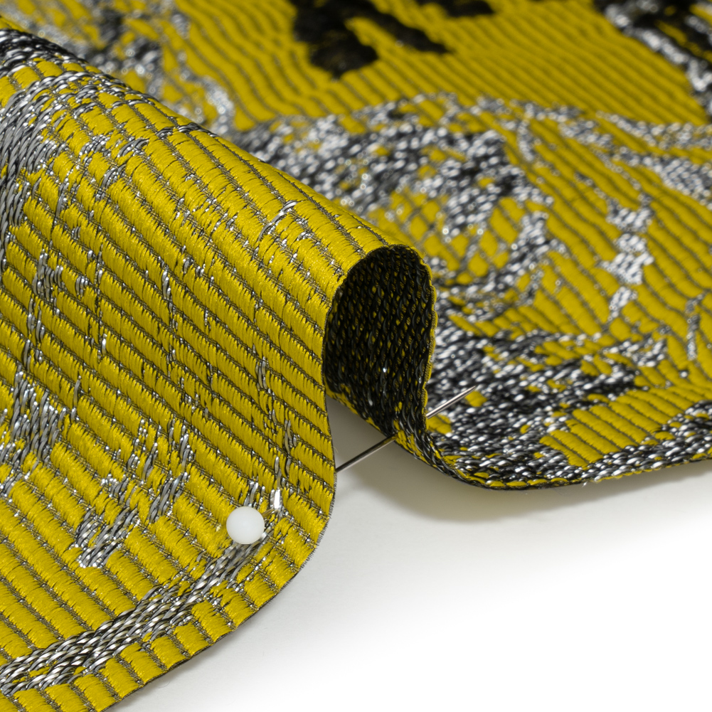 There's elegance in the tropics; this Yellow, Black and Metallic Silver Palm Leaves Luxury Burnout Brocade is a testament. Yellow-green ripples roll like heat waves through the background, yielding a soft yet ribbed hand—which is just one texture displayed on this complex face. With a grainy metallic threading, sheer background, and three-dimensional leaves, this brocade has a rich personality that turns special occasions into extraordinary nights. With a supple drape and a medium-weight feel, create show-stopping gowns, semi-structured jackets, A-line dresses, and more. A lining will increase structure and opacity if desired.