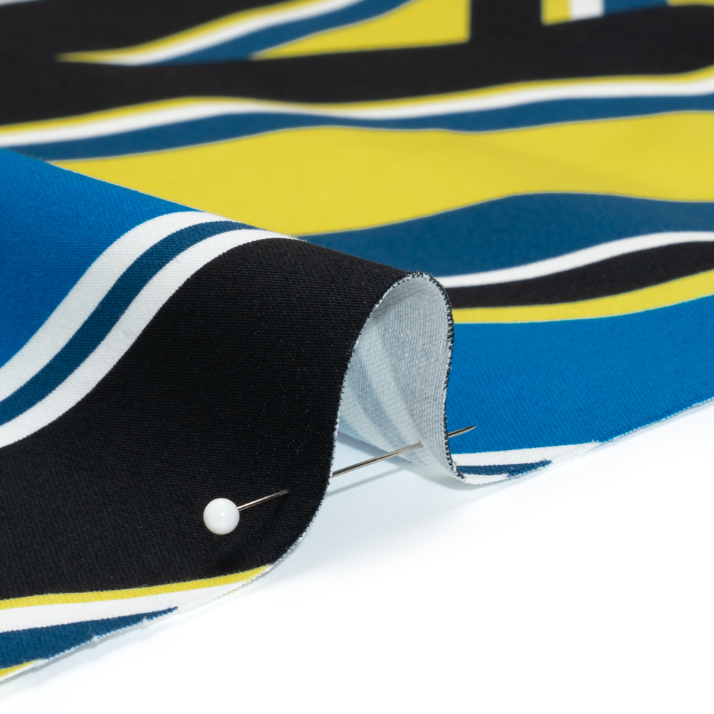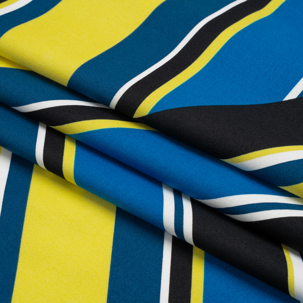 Add some sunshine to your next project with this Yellow, Royal Blue and Black Large-Scale Geometric Stretch Cotton Sateen! Stripes pass in every direction, bold lines of brilliant blue, bright yellow, black, and white creating a patterned series of rhombuses and triangles that draw the eye every which way. Featuring a snug one-way stretch along the weft and a smooth, cool hand, this sateen has a full drape that's perfect for bright statement trousers, wildly colorful blazers and jackets, or full skirts like circle skirts. The large-scale pattern is great for garments with blockier pieces and greater surface area to really show off the print! Opaque, a lining isn't necessary for most projects but is great to add structure and a polished finish.