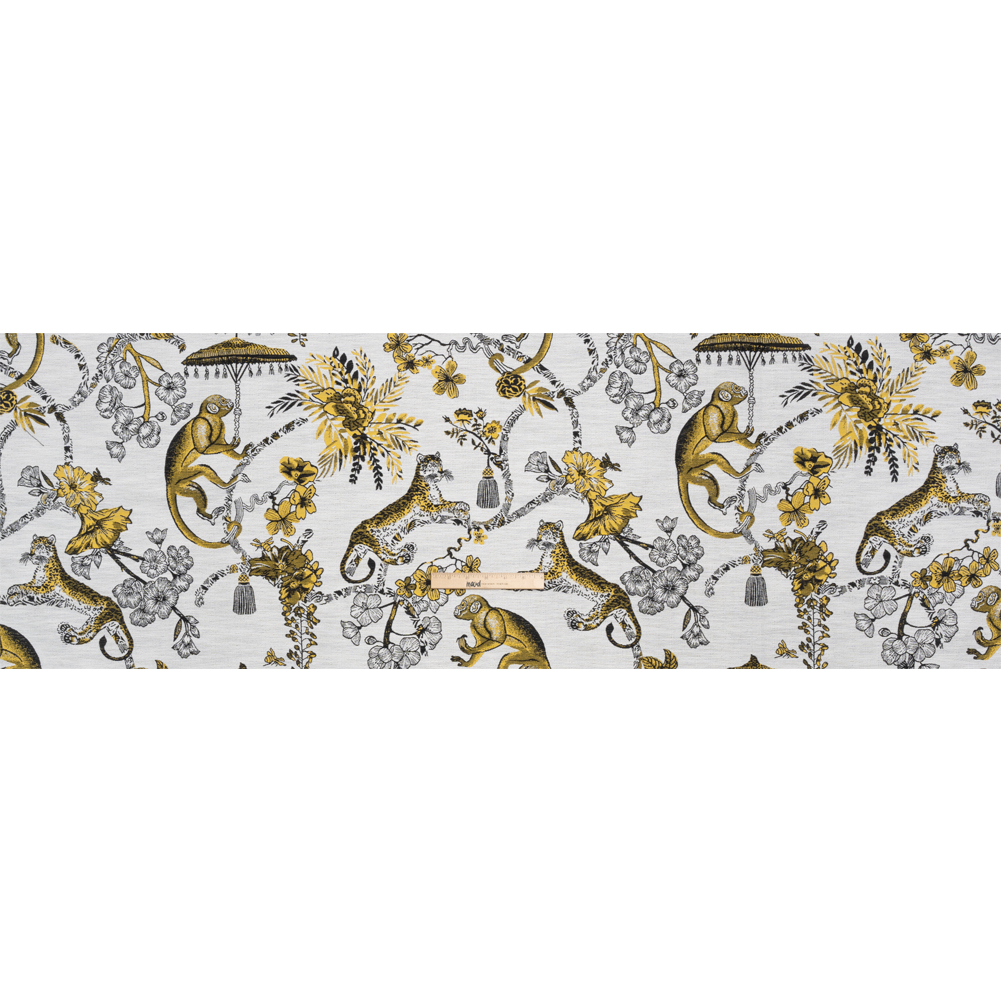 Talk a walk on the wild side with this Yellow Topaz Exotic Pets and Flowers Upholstery Jacquard.