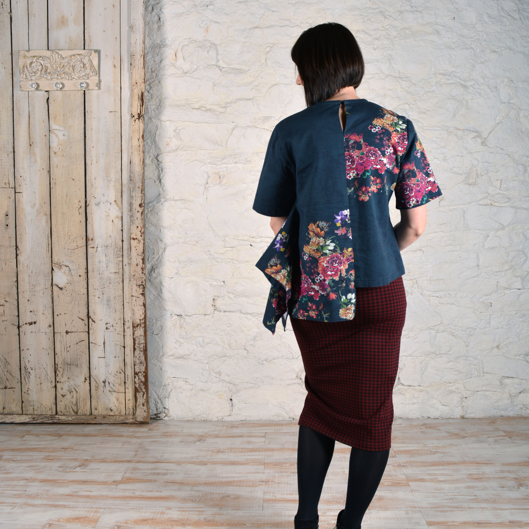 relaxed fit, hip-length top with center front and back seams, a unique left