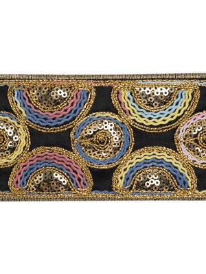 Yaya Han Metallic Embroidered and Sequined Woven Ribbon Trim – Lagos Black, Gold and Rainbow Circles, 2.63″ – Cosplay Collection
