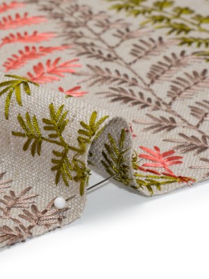 Embroidered Linen Blend Woven – Spring Time Green and Pink Leafy Plants – Attica Collection