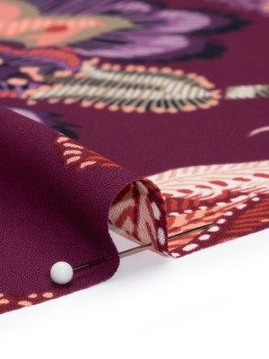 Polyester Crepe Print – Berry, Coral Pink, and Purple Jacobean Floral – Designer Deadstock