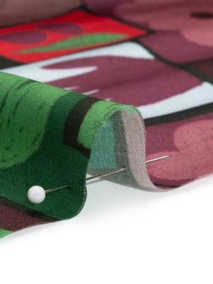 Sustainable and Recycled Viscose Satin Print – Purple, Green and Red Simple Symbols Patchwork – Mood Exclusive Come Together