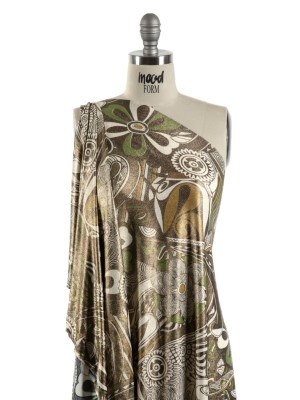 Green, Olive and Black Retro Floral SIlk Jersey with Gold Foil