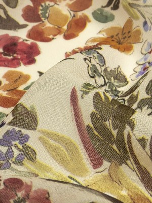 Polyester Crepe de Chine Print – Burnt Russet Brown, Yellow and Purple Floral – Mood Exclusive Language of Flowers