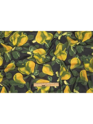 Famous NYC Designer Italian Amber and Green Pears Printed on Black Viscose Georgette