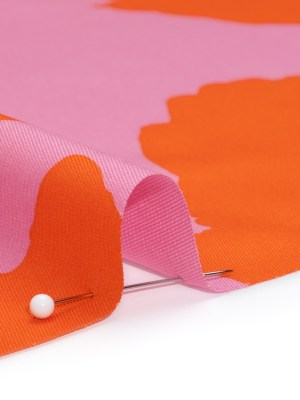 Polyester Twill – Pink and Red-Orange Florals and Striped Borders – Made in Italy