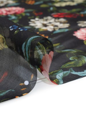 Silk Organza Print Made in Italy – Black, Red and Green Florals – Deadstock
