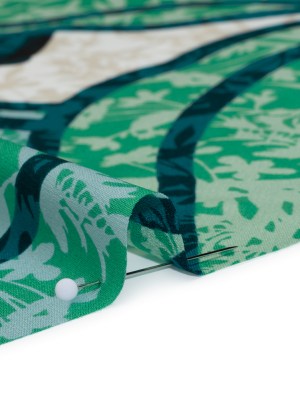 Mechanical Stretch Polyester Charmeuse Print – Beige, Teal and Green Tropical Floral Borders – Designer Deadstock