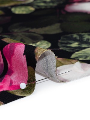 Polyester Satin – Pink, Green and Black Photorealistic Florals – Mood Exclusive Petals After Dark Print