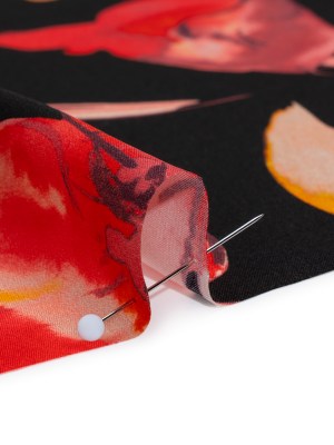 Silk Charmeuse Print 16MM, Made in Italy – Black, Orange and Red Illustrated Watercolor Flowers