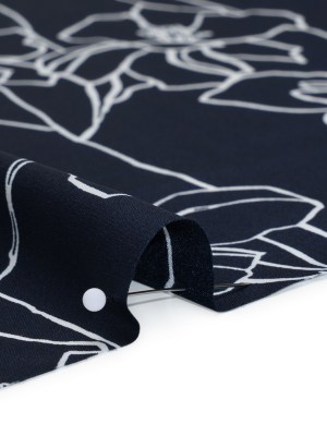 Stretch Polyester Charmeuse Print – Navy and White Floral Outlines – Designer Deadstock