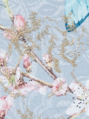 Birds and Branches Digitally Printed on a Gray Butterfly Jacquard with Metallic Gold Embroidery