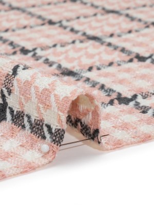 Wool Blend Tweed with Clear Eyelash Fringe and Baby Sequins – Charcoal, Rose and Cream Houndstooth Plaid – Deadstock
