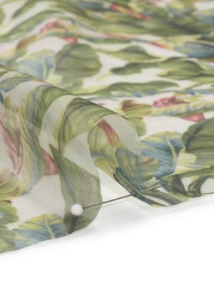 Polyester and Viscose Organza – Pink, Blue and Green Tropical Leaves, Birds and Flowers