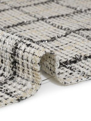 Metallic Polyester Tweed – White, Gold and Black Fringed Windowpane Check