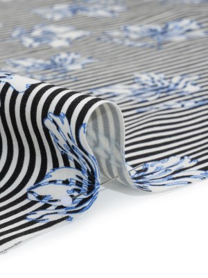 Stretch Rayon and Polyester Twill – Black, White and Blue Flowers over Stripes – Deadstock