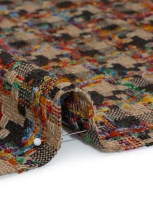 Wool Blend Tweedy Boucle Woven – Brown, Beige and Rainbow Blocky Houndstooth