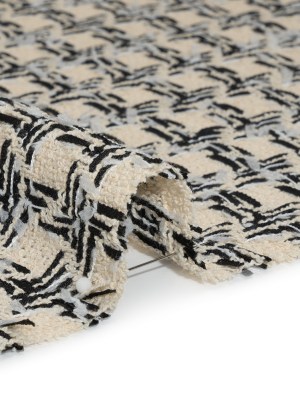 Polyester Tweed with Clear Eyelash Fringe – Blue, White and Black Abstract – Deadstock