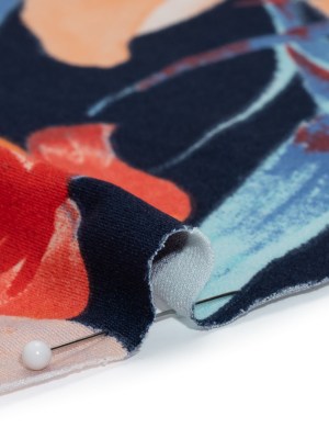 Stretch Polyester Tricot – Navy, Orange and Aqua Blue Painterly Flowers – Designer Deadstock