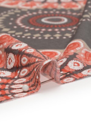 Stretch Polyester Tricot with Puffy Print – Gray, Coral Red and White Circle Medallions – Designer Deadstock