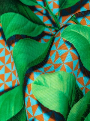 Compression Swimwear Tricot, UV Protective with Aloe Vera Microcapsules – Green Leaves and Orange Geometric – Caye Collection