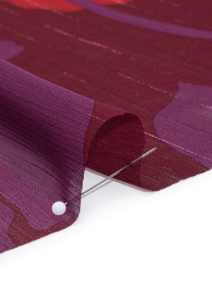 Crinkled Polyester Chiffon Print with Metallic Pinstripes – Burgundy, Brick Red and Plum Floral – Designer Deadstock