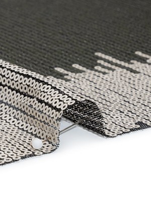 Baby Sequins on Black Stretch Mesh – Olive Green, Light Beige and Tan Ikat Stripes – Deadstock