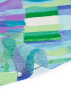 Crinkled Polyester Chiffon Print – Blue, Lime Green and Purple Painted Plaid – Designer Deadstock
