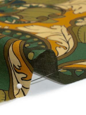 Rayon Challis – Olive Green, Teal and Mango Orange Wavy Floral Stripes – Nymph’s Harvest Print – Mood Exclusive Acadia Collection