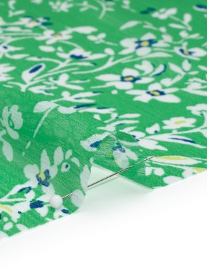 Crinkled Polyester Chiffon – Kelly Green, White and Blue Floral – Designer Deadstock