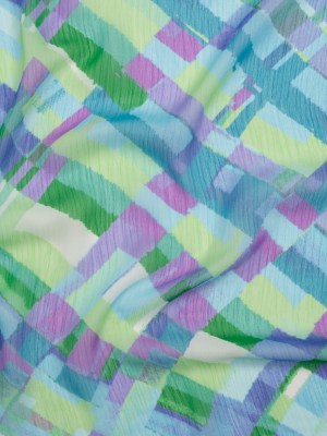 Crinkled Polyester Chiffon Print – Blue, Lime Green and Purple Painted Plaid – Designer Deadstock