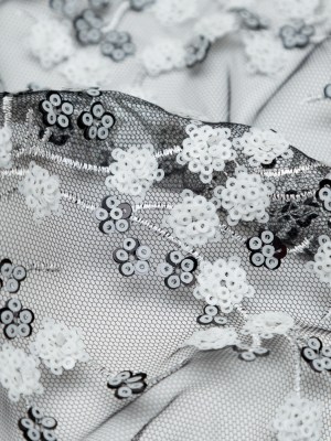 Stretch Net with Sequins – White Fancy Floral Clusters on Black
