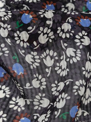 Famous NYC Designer Blackened Pearl, Jet Stream and Alaskan Blue Tossed Floral and Gingham Silk Georgette