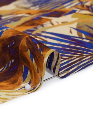 Satin Faced Silk Chiffon Print Made in Italy – Gold, Brown and Ultramarine Blue Palms and Tropical Leaves – Deadstock