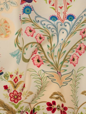 Crinkled Silk Crepe de Chine Print Made in Italy – Beige, Tan and Red Flowers and Crests – Deadstock