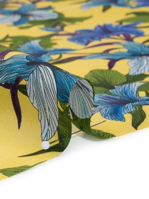 Silk Crepe de Chine Print Made in Italy – Lemon Yellow, Blue and Green Lilies – Deadstock