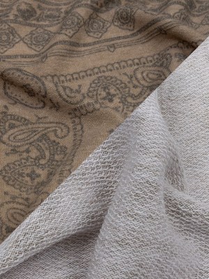 Tan and Gray Paisley Patchwork Stretch Polyester and Rayon French Terry