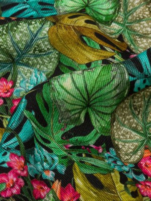 Polka Dotted Viscose Jacquard Print – Black and Green Leaves and Flowers – Mood Exclusive Monstera Mambo
