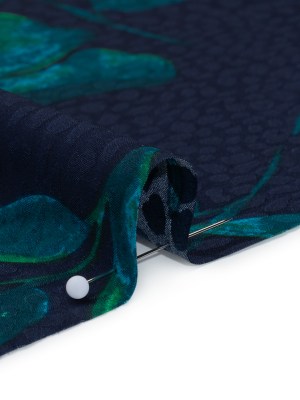 Stretch Satin Faced Polyester Jacquard – Navy, Teal and Green Tropical Plants on Animal Spots – Designer Deadstock