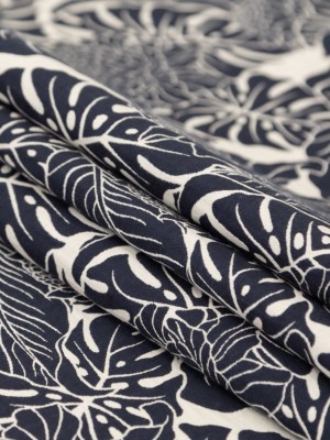 Italian Carbon Blue and Ecru Floral Cotton Jacquard