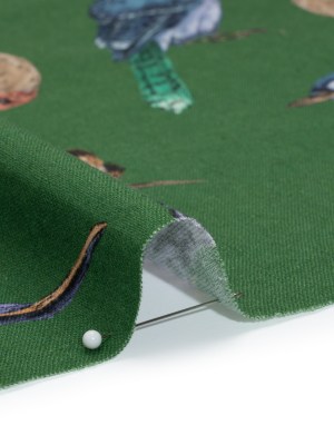 Linen and Rayon Woven – Green, Blue and Beige Little Birds – Birdsong Saunter Print – Mood Exclusive Acadia Collection