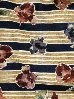 Linen and Rayon Woven – Yellow and Navy Floral over Stripes – Harmonious Hibiscus Print – Mood Exclusive Tumunyana Collection