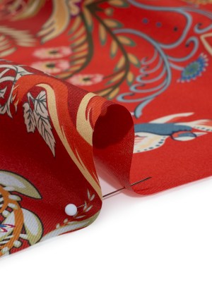 China Silk/Silk Habotai Print Made in Italy – Red, Green and Golden Yellow Flowers and Crests – Deadstock