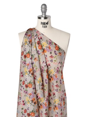 China Silk/Silk Habotai Print Made in Italy – Greige, Red and Purple Fancy Flowers – Deadstock