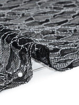 Corded Raschel Lace Panel with Finished Edges – Black and White Outlined Leaves